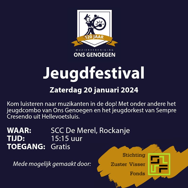 Op zaterdag 20 januari trapt muziekvereniging Ons Genoegen Rockanje het 120-jarig jubileum af met het jeugdfestival. Tijdens dit event krijgen muzikanten in de dop de kans om op een podium hun talent te tonen.