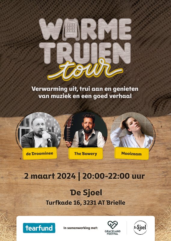Verwarming uit, warme trui aan en samen genieten van mooie muziek en een goed verhaal. Bezoek een Warme Truienavond: een intiem concert dat gehost wordt door spoken-word-artiest De Droominee (Rik Zutphen). Gegarandeerd een ontspannen, gezellige én inhoudelijke avond! Met inspiratie om samen recht te doen en rechtvaardig en duurzaam te leven. De Warme Truientour is een initiatief van Tearfund in samenwerking met Graceland Festival.