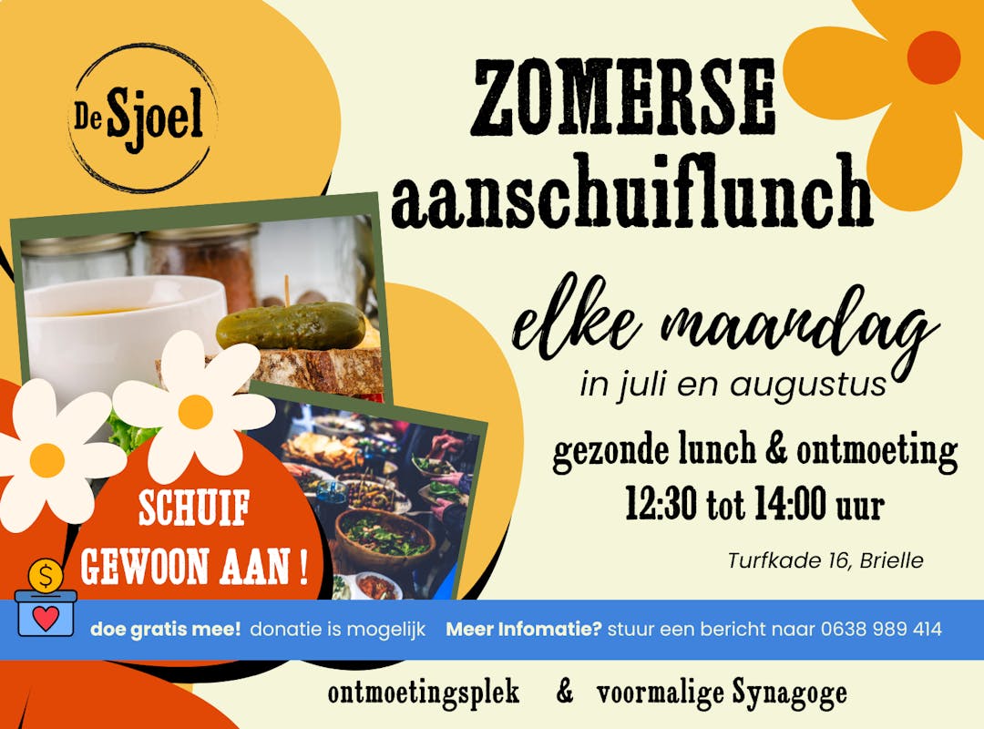 Samen eten en nieuwe mensen ontmoeten in een gezellige sfeer in Brielle aan de Turfkade. Elke maandag kun je in De Sjoel bij ons terecht voor een gezonde lunchmaaltijd. Vanaf 10.00 uur is er Open Huis in De Sjoel, is er koffie of thee en is er altijd ruimte voor gesprek en ontmoeting. De lunch begint rond 12.30 uur. Wees welkom als je alleen of samen bent. Kom je met meerdere personen of heb je dieetwensen? Stuur een bericht. We proberen vegetarische en glutenvrije opties aan te bieden, maar er is altijd vers gemaakte soep. Neem contact op met Tonn den Otter als u nog vragen heeft! Contact: of 0638 989 414