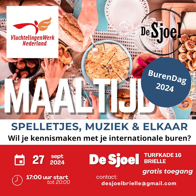 In samenwerking met VluchtlingenWerk Nederland (Brielle) houden wij een International Maaltijd met ook muziek uit verschillenden landen. Neem iets mee om te delen (eten uit eigen land). Ontmoet nieuwe buren en oude buren op een laagdrempelige manier. Activiteiten aanwezig voor kinderen. Vanaf 17uur, eten begin rond 18uur, gratis toegang. Aanmelden kan via .