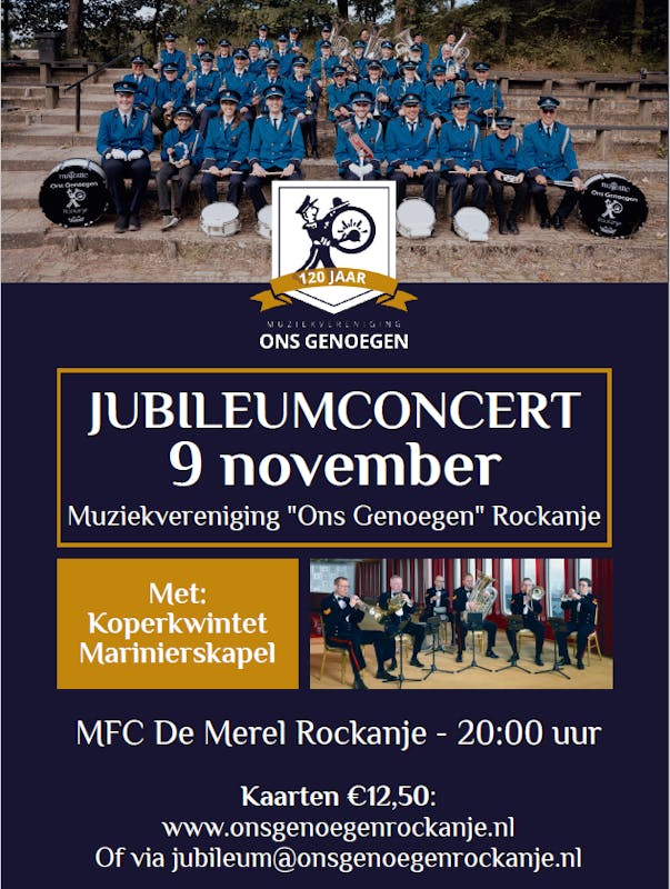 Het afgelopen jaar vierde Ons Genoegen het 120-jarig jubileum. Het feestjaar is nog niet voorbij. Op zaterdag 9 november wordt het jubileum feestelijk afgesloten met een Jubileumconcert in de sporthal van de Merel. Kaarten voor dit concert zijn vanaf nu te reserveren via .