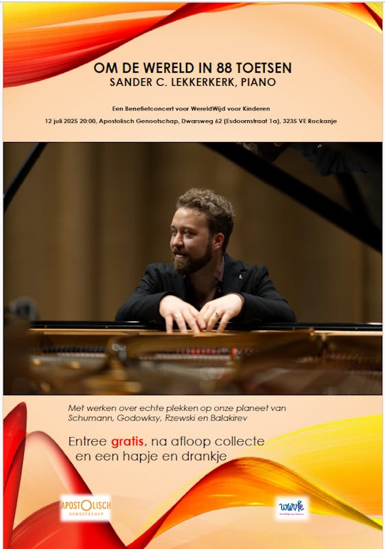 Op zaterdag 12 juli zal Sander C. Lekkerkerk een Benefietconcert geven voor "WereldWijd voor Kinderen". Hij zal op de piano werken ten gehore brengen over echte plekken op onze planeet van Schumann, Godowksy, Rzewski en Balakirev.
