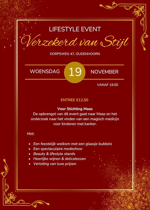 Kom gezellig langs het wordt een feestelijke avond vol inspiratie en gezelligheid. Bij de entree krijgt u een heerlijke bubbel aangeboden. Er is een modeshow, er zijn beauty en lifestyle stands, heerlijke wijnen en delicatessen. Ook zal er een loterij zijn met leuke prijzen.