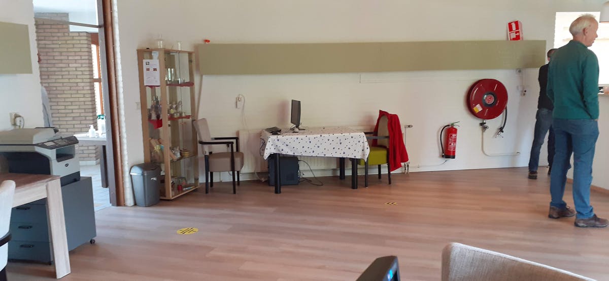 Aangekomen bij de "Apollo" stond het welkomst-comité te trappelen om ons binnen te laten, de ruimte was al geopend, de vlag ( FijnJeTeZien.nl) al uitgehangen). na een 1,5 meter begroeting werden de spullen uitgepakt, moeders de vrouw had de beschikbare handschoentjes aangetrokken na een uitgebreide ontsmetting aan de deur, en was haar domein binnengelopen. Ik zelf keek even rond, en met de regels in acht te nemen bouwde ik 2 desktops op. De tafels stonden apart. de stopcontacten in de buurt. 4 meter van elkaar waren de eilandjes geactiveerd. Het netwerk en de netwerkprinter werden opgesteld.