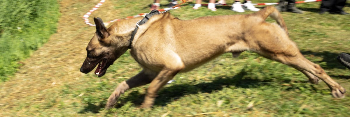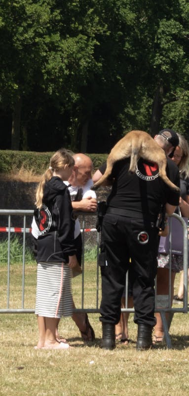 Eerst worden de honden geshowd. Een herdershond wordt op de schouders genomen en zo loopt de begeleider rond tussen het publiek. Wat een magnifiek plaatje om te zien! Daarna begint het pakwerk op het land, eerst op het veld en later op een auto.