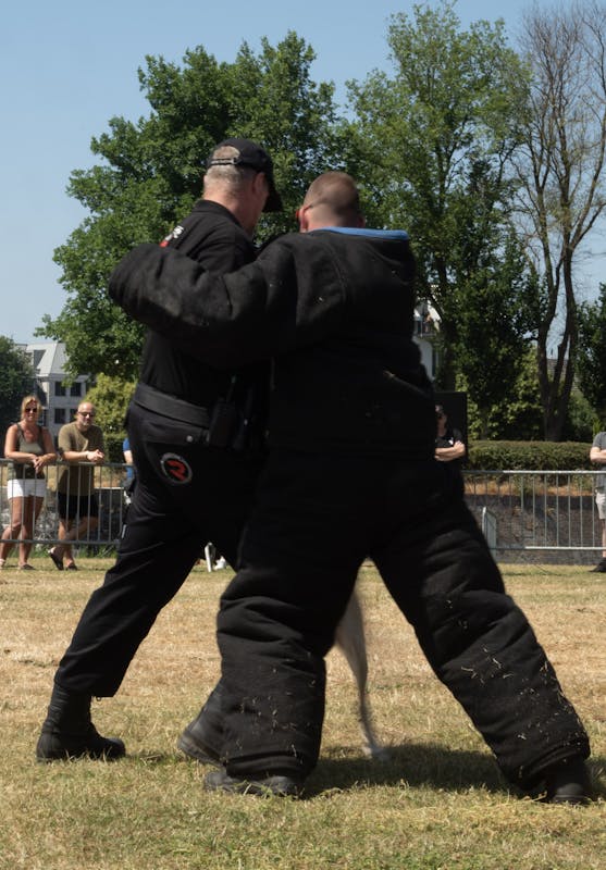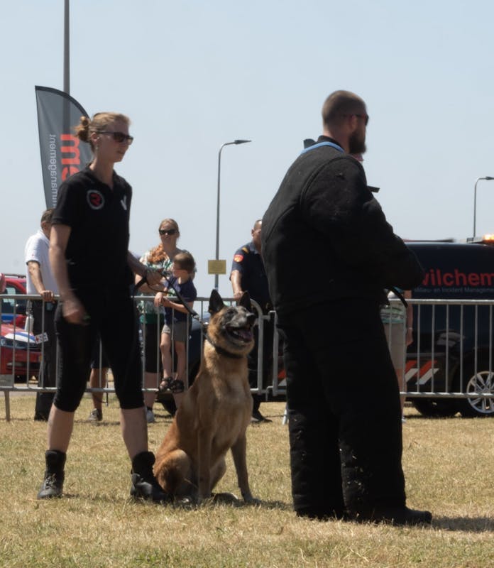 De samenwerking tussen de begeleiders, de honden, de pakwerker en de mensen eromheen is duidelijk zichtbaar. Voor de demonstratie staan ze in een stand, en sommigen lopen rond met hun honden. Vriendelijk wordt er aan iemand uit het publiek gevraagd om zijn eigen hond tijdens de demonstratie uit de buurt te houden. Terwijl het publiek onder andere het pakwerk mocht aantrekken, alleen het vest al weegt 20 kilo ... De pakwerker moet het wel warm hebben gehad op deze toch al zeer warme zaterdag.