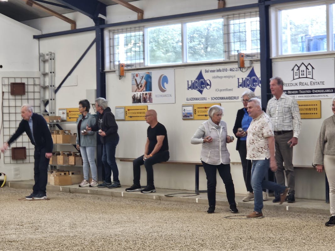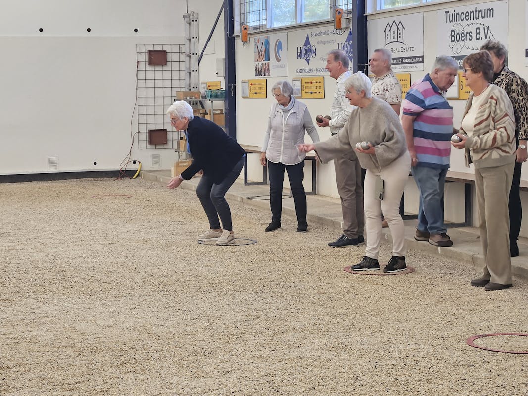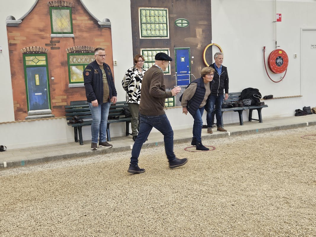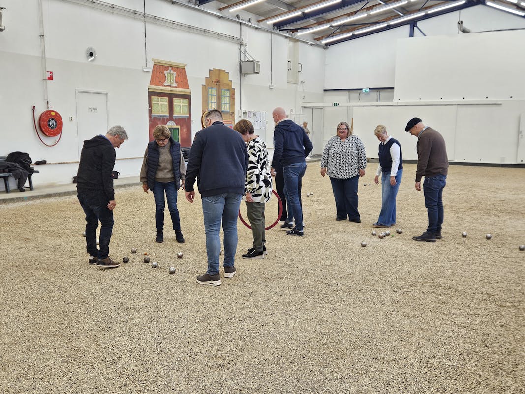 In de ruime hal met maar liefst 15 banen speelden we fanatiek een potje Jeu de Boules. We kregen eerst wat uitleg over de regels en techniek — en daarna barstte de strijd vol enthousiasme los!