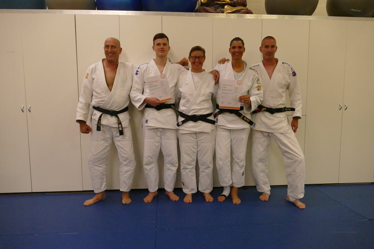 Een aantal judoleraren van de omliggende clubs werken hier aan hun eigen vaardigheid. Afgelopen zaterdag was bijzonder omdat trainers van de Kooistee (Hellevoetsluis), Ichikan (Oostvoorne en Rockanje) en de Kriekel (Ouddorp) hebben samengewerkt om deze danexamens tot een goed eind te brengen. De vele uren training aan het aanscherpen van de technieken en kata’s werpen zijn vruchten af voor Suzanne Tournier en Stefan Dekker, zij mogen vanaf nu de 2e dan dragen. Bijzonder is dat er van de 9 kandidaten die in hetzelfde blok zitten en beoordeeld worden er slechts 3 zijn geslaagd. Waarvan dus 2 van Sportstichting Je eigen Pad.
