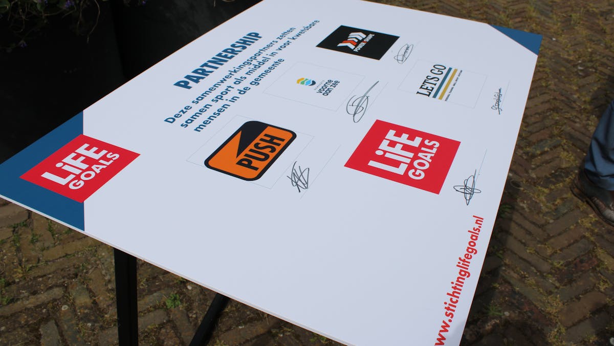 Hierna tekenden alle partners de samenwerkingsovereenkomst. “Ik hoop dat er volgend jaar een inwoner van Voorne aan Zee op het promotiebord staat,” was het slotwoord van de wethouder, nadat een vertegenwoordiger van Life Goals Nederland het bord toonde.