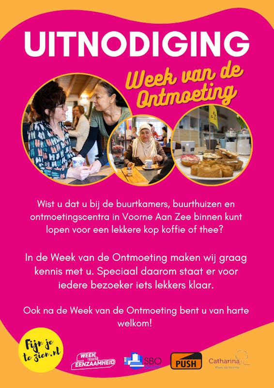 Tijdens de Week van de Ontmoeting - van 26 september t/m 2 oktober - staat voor iedereen die aanschuift aan de koffietafel een lekker gebakje klaar. Gewoon, omdat u welkom bent. Ook na deze week staat de deur voor u open. Kom erbij!