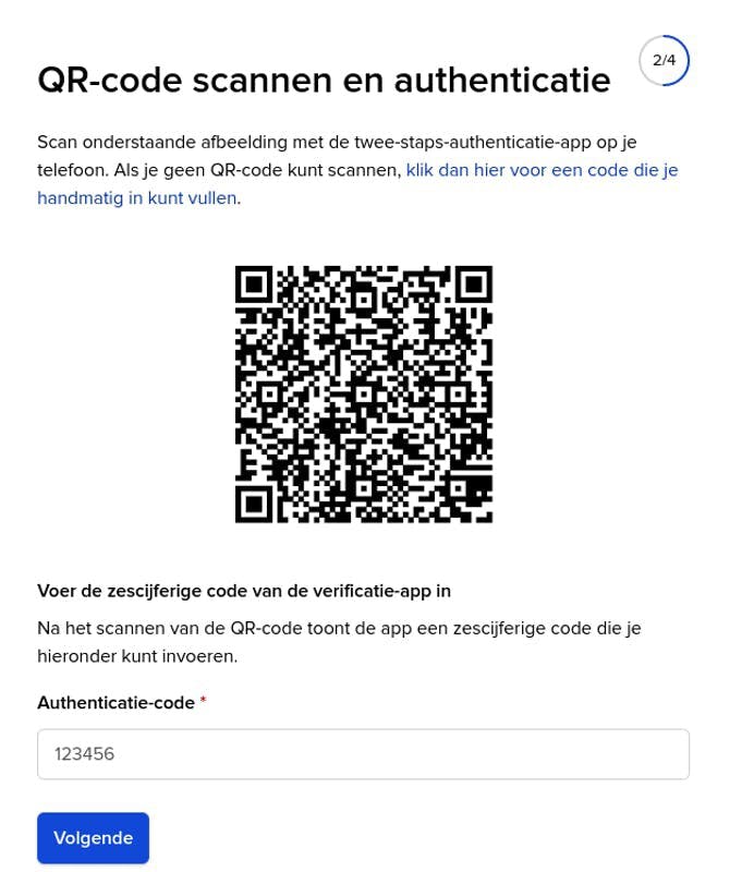 Om deze code in te vullen gebruik je een speciale app op je telefoon, een 'authenticator' app. Die geeft je een steeds wisselende code om in te vullen. Wij adviseren de authenticator app van Google.