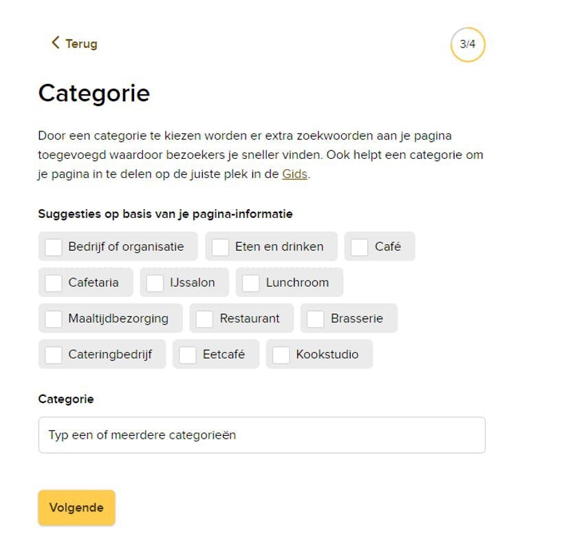 Bij het aanmaken van een pagina kun je nu makkelijker een categorieën kiezen. Het systeem analyseert jouw input voor de ‘Naam’ en ‘Beschrijving’ en doet op basis hiervan al een aantal categoriesuggesties. Hier hoef je dus niet zelf over na te denken.