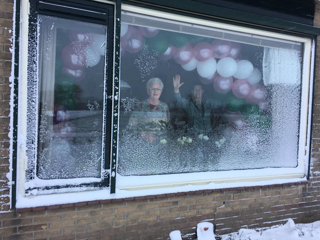 Echter, met vrieskou, sneeuwstorm en stuifsneeuw in de voorspellingen is het plan drastisch aangepast. De drive-through is afgelast en de ballonnenboog is opgesteld in de woonkamer. De post (best een stapel) van zaterdag onderschept en op zondagmiddag aan haar gegeven als een cadeau. Omdat Lena niets van haar ‘feest’ af wist was dit toch een welkome afwisseling van de over de algemeen saaie dagen. Dat de deelnemers aan de drive-through haar in de loop van volgende week gaan bellen om haar alsnog te feliciteren is de nasleep van deze dag. Al met al een afwisselende en bijzondere dag in een bijzonder jaar. En toch nog een verjaardag om niet snel te vergeten.
