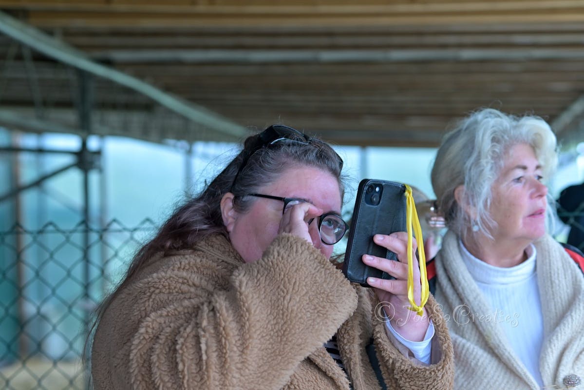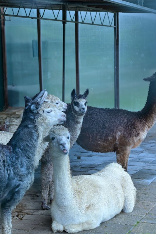 Gelukkig vond de lunch plaats in een loods en niet buiten, en met een paar warme plaidjes over de knieën was het toch heerlijk comfortabel. Na de verrukkelijke lunch gingen we naar buiten om de alpaca's in levenden lijve te bewonderen, want dat was natuurlijk waar onze maatjes naast het gezellige samenzijn speciaal voor gekomen waren.